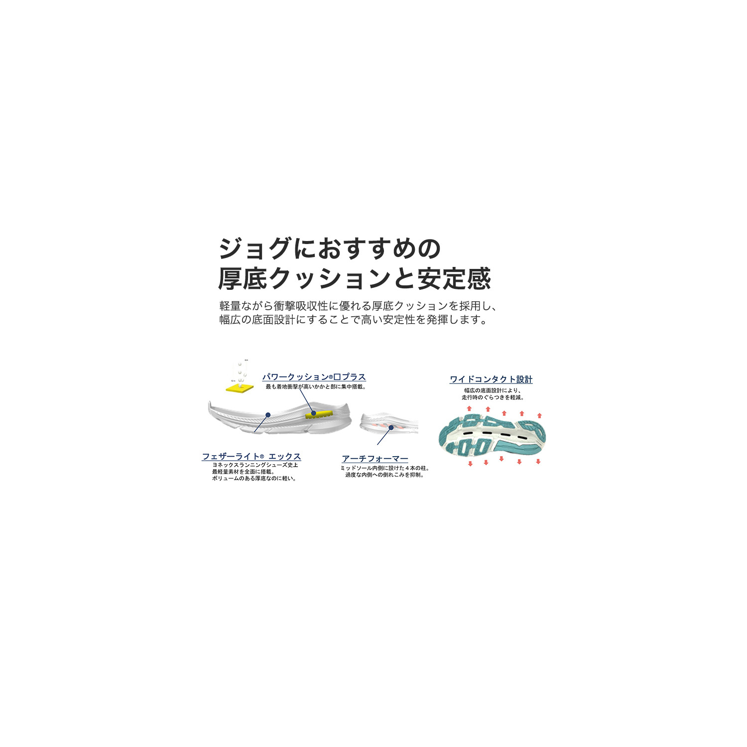 パワークッション プラス、フェザーバウンスフォーム、フェザーライトX、デュラブルスキンライト、低反発インソール、3Dパワーカーボン、ワイドコンタクト設計、エンデュランスラバー、アーチフォーマー