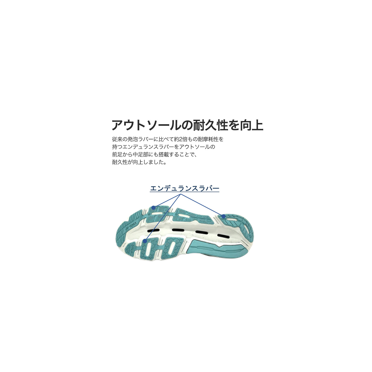 高耐久のラバー素材(従来品搭載の発泡ラバー比:耐摩耗性約2倍※)をアウトソール全面に採用しました。スピード走行時に擦り減りが多い踏み付け部に集中配置し、グリップ性を高める凹凸のソール。